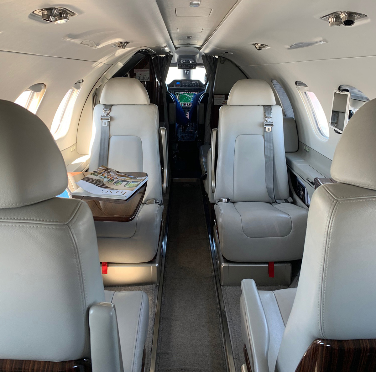 December, 2015. Eight plus one (8+1) passenger executive interior features a RH forward two-place divan, center club, two forward facing seats, and an aft belted lav. All seating is done in Excalibur Gray leather, complimented by Polar ultraleather sidewalls and ceiling, Charcoal nubuk dado panels, and Mulhollan carpeting. High gloss CV Qtr Rosewood veneer cabinetry are accented by Willow corian countertops and Nickel plating throughout. Left hand forward galley contains hot jug, refreshment center, and ample storage space. Aft lavatory features a belted seat, sink and extra storage. The entertainment system features GoGo Biz 4G WiFi powered by the AVANCE L5 Entertainment System, XM Radio, six Dolby Dimensions wireless headsets, multiple USB charging ports, and 110V outlets.